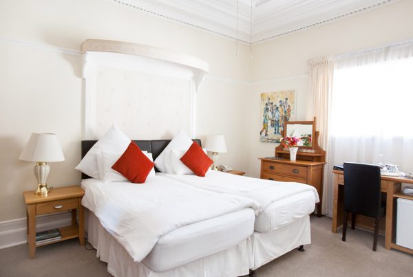 All rooms include either queen, double or twin beds, en suite bathroom (with bath and shower, or shower only), mini-bar fridge, kettle with tea/coffee hospitality tray, Satellite TV, direct line telephone, private wall safe, ceiling fan and heater. Unlimited wireless internet access is available free of charge.
